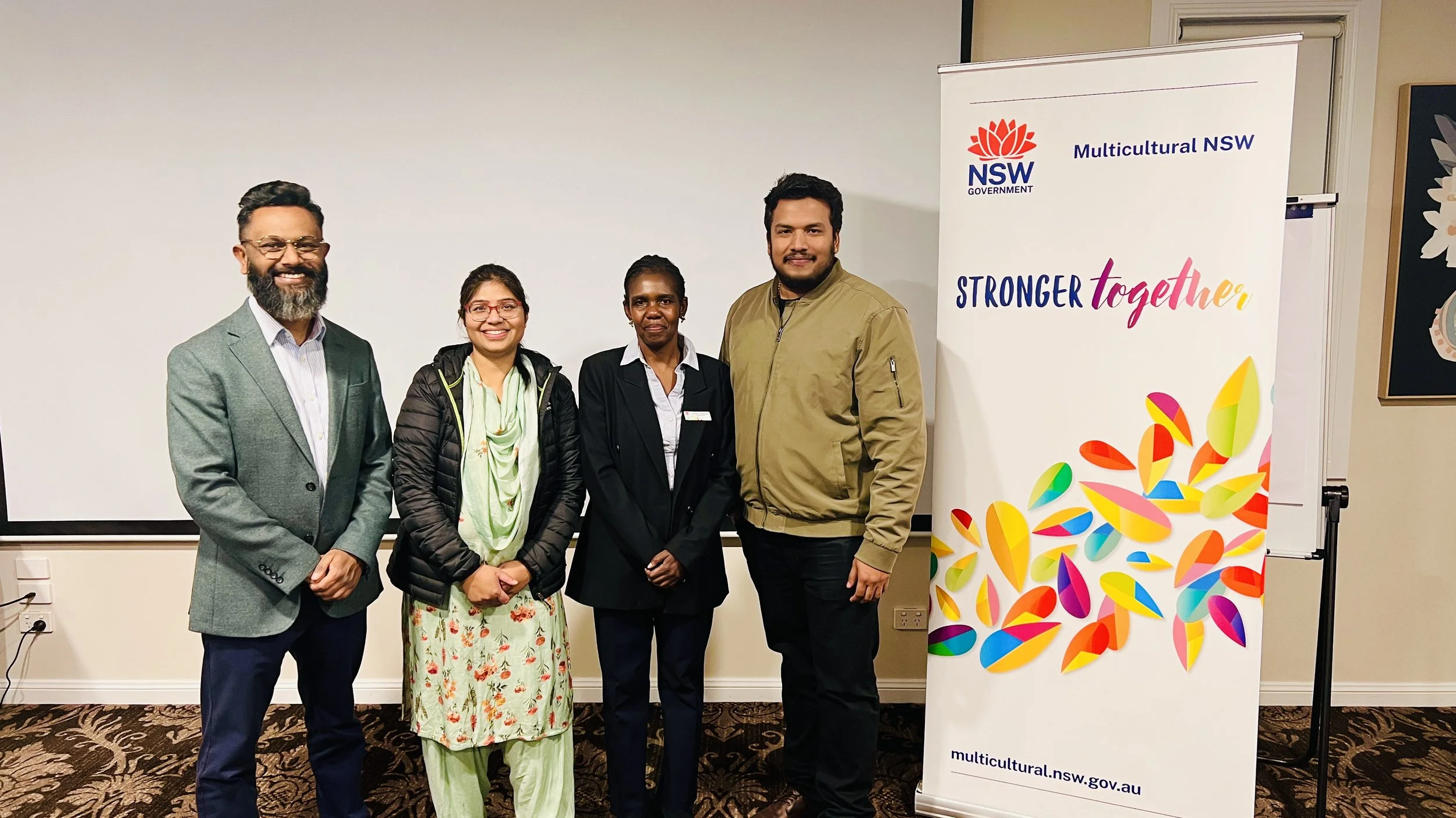 Image L to R: James Jegasothy, Deputy CEO of Multicultural NSW, Dr Saba Nabi, Advisory Board Member Multicultural NSW, Tabitha Chepkwony Community Engagement Officer at Multicultural NSW, Jay Local Connector Welcome Experience, RDA Riverina